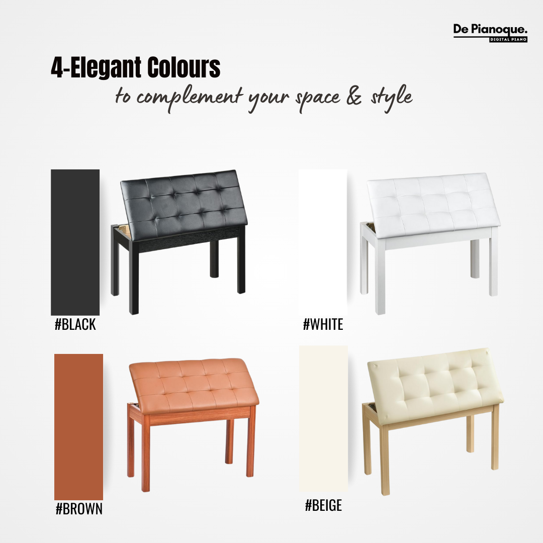 Perfect for duet performances or shared practice sessions, the 2-Seater Solid Wood Piano Bench combines comfort with functionality. Crafted from solid wood, this bench features a spacious cushioned seat and a built-in storage compartment beneath the lid—ideal for storing sheet music and accessories. Available in four elegant colors, it complements a variety of piano styles and home décors.