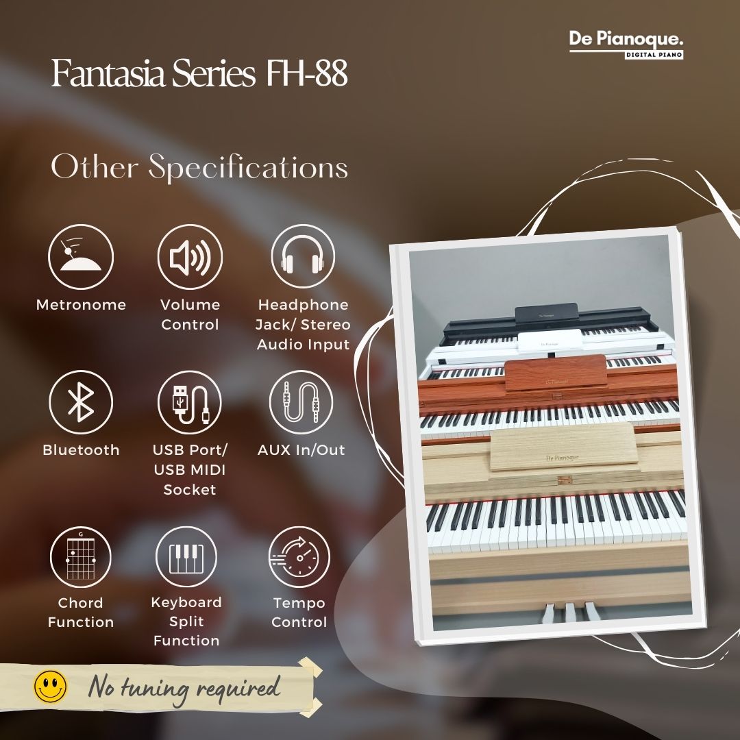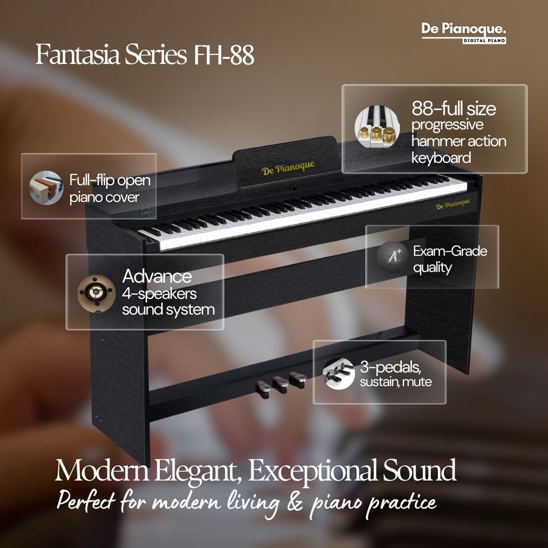 Fantasia Series (FH-88B) combines modern elegance with superior sound quality. Equipped with an advanced 4-speaker sound system, it delivers rich, immersive tones with surrounding effects that bring your music to life. Whether you’re playing at home or in a music school, FH88 ensures an exceptional listening experience, enhancing every note with clarity and depth.